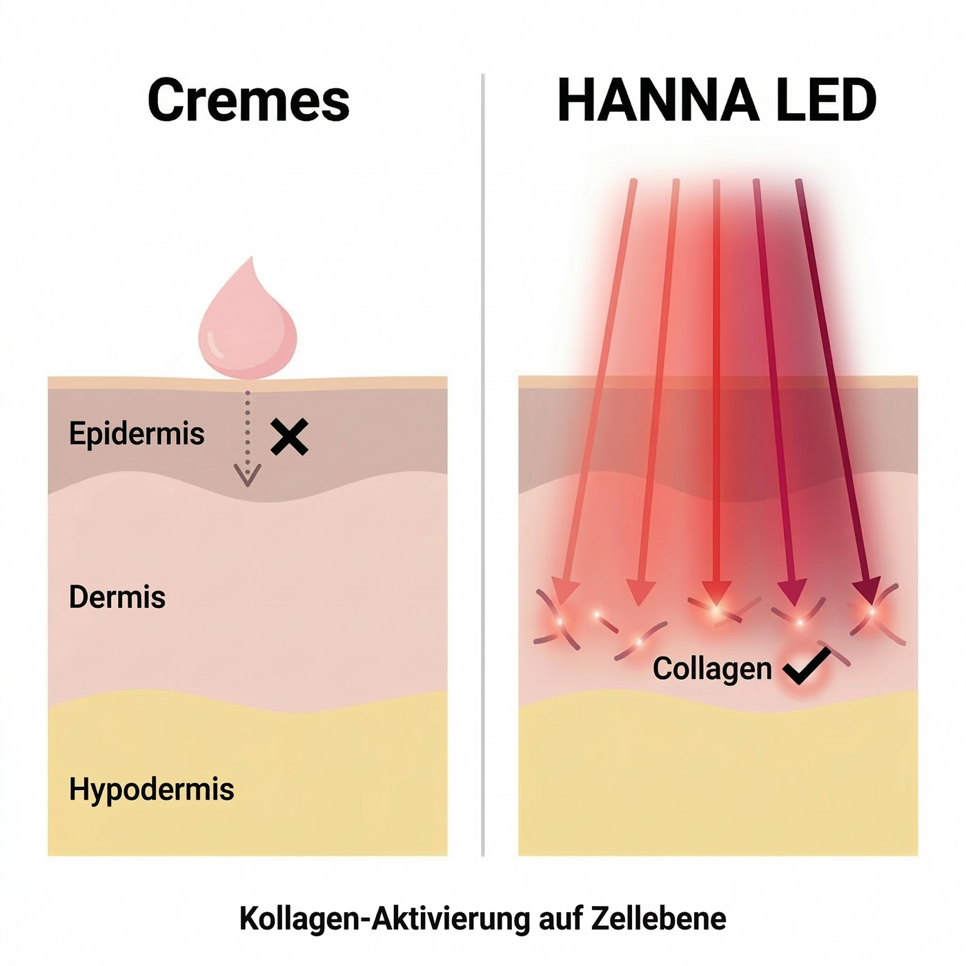 HANNA arbeitet anders: Rotes LED-Licht (630nm) und Nahinfrarot (830nm) dringen direkt in die Hautschicht ein, wo Kollagen entsteht. Die Zellen werden aktiviert â wie ein Akku, der wieder aufgeladen wird.